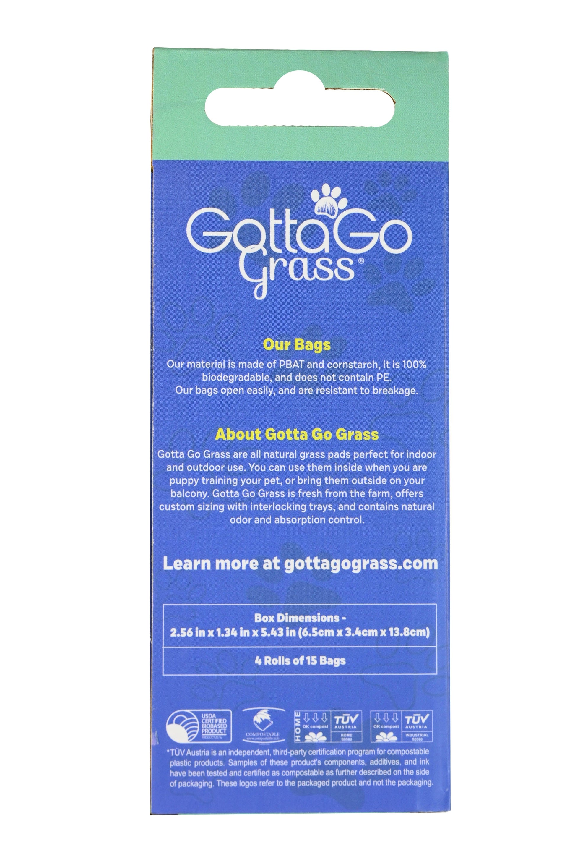 Gotta Go Grass Dog Waste Bags: Our eco-friendly and biodegradable waste bags make responsible waste disposal easy and environmentally friendly. Each roll contains 15 bags, designed for convenience and sustainability, ensuring that you can clean up after your dog with a clean conscience.